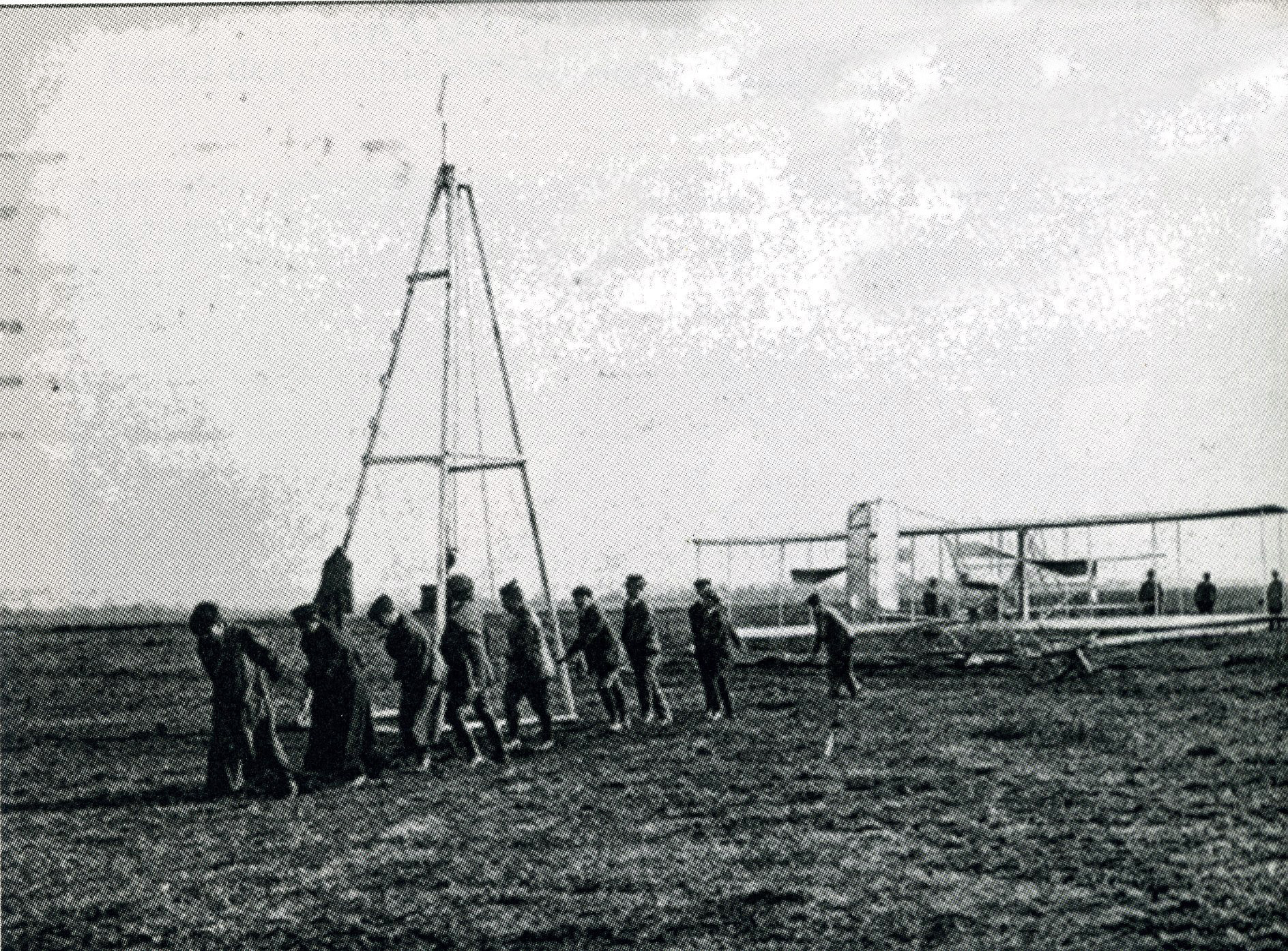 Grupo de voluntarios elevando la catapulta del Flyer A en Pau